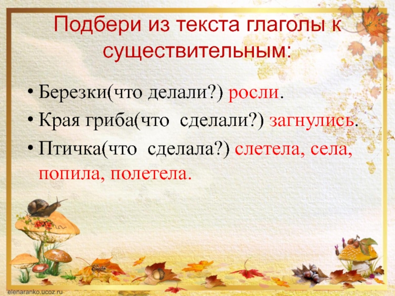 Подбери из текста глаголы к существительным:Березки(что делали?) росли.Края гриба(что сделали?) загнулись.Птичка(что сделала?) слетела, села, попила, полетела.