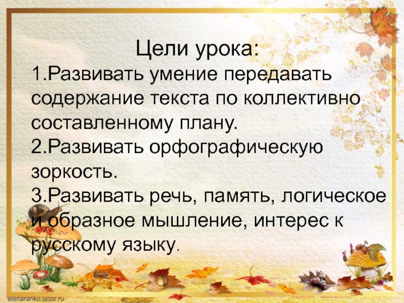 умение передавать содержание текста по коллективно составленному плану. 2.Развивать орфографическую зоркость. 3.Развивать речь, память, логическое и образное мышление, интерес к русскому языку.