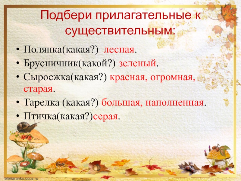 Подбери прилагательные к существительным:Полянка(какая?) лесная.Брусничник(какой?) зеленый.Сыроежка(какая?) красная, огромная, старая.Тарелка (какая?) большая, наполненная.Птичка(какая?)серая.