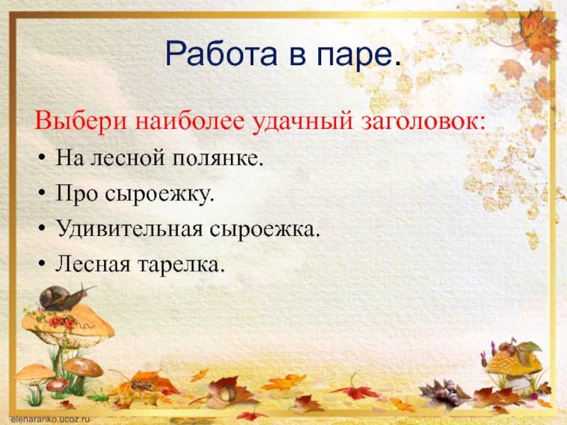 Работа в паре.Выбери наиболее удачный заголовок:На лесной полянке.Про сыроежку.Удивительная сыроежка.Лесная тарелка.
