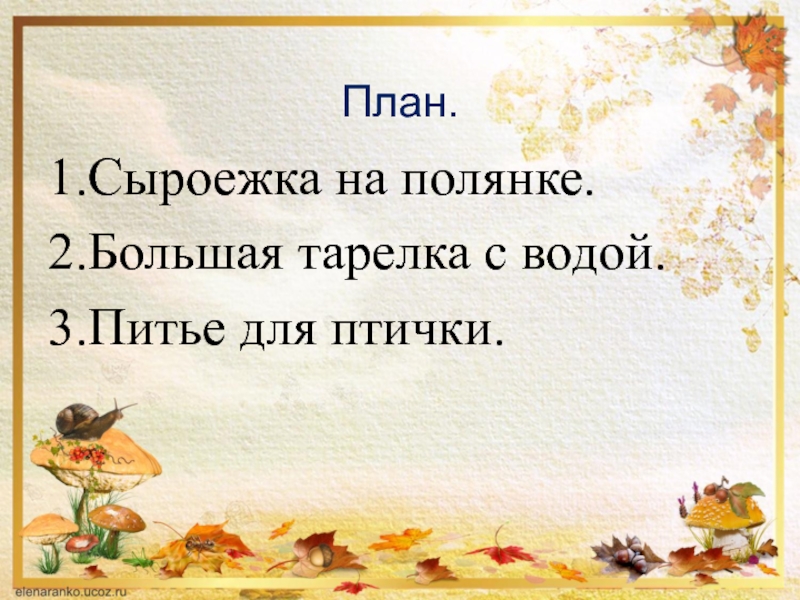 План. 1.Сыроежка на полянке.2.Большая тарелка с водой.3.Питье для птички.