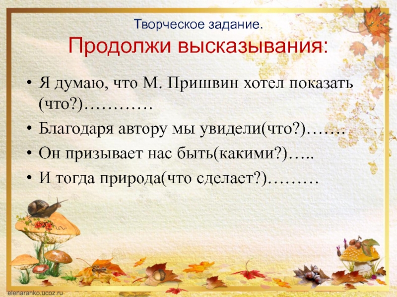 Творческое задание. Продолжи высказывания: Я думаю, что М. Пришвин хотел показать(что?)…………Благодаря автору мы увидели(что?)…….Он призывает нас