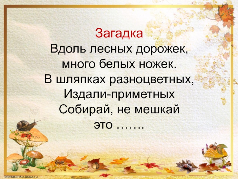 Слайд 5Загадка Вдоль лесных дорожек, много белых ножек. В шляпках разноцветных, Издали-приметных Собирай, не мешкай это …….
