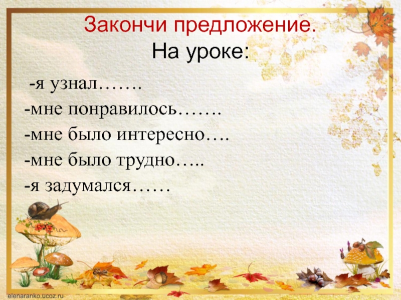 Закончи предложение. На уроке: -я узнал…….-мне понравилось…….-мне было интересно….-мне было трудно…..-я задумался……