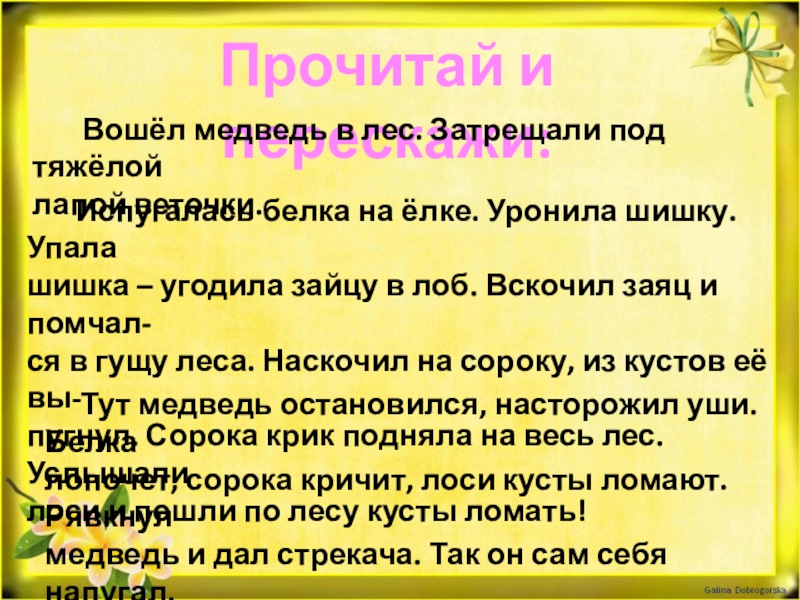 Испугалась белка на ёлке. Уронила шишку. Упала