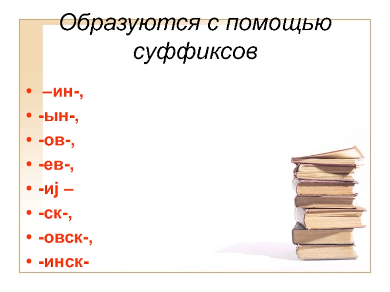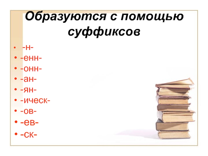 Образуются с помощью суффиксов -н- -енн- -онн- -ан- -ян- -ическ- -ов- -ев- -ск-