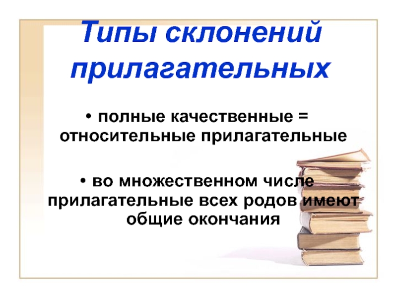 Типы склонений прилагательныхполные качественные = относительные прилагательные  во множественном числе прилагательные всех родов имеют общие окончания