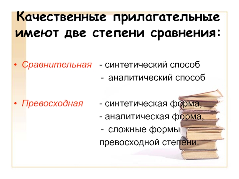 Качественные прилагательные имеют две степени сравнения: СравнительнаяПревосходная- синтетический способаналитический способ- синтетическая форма, - аналитическая форма, сложные формыпревосходной