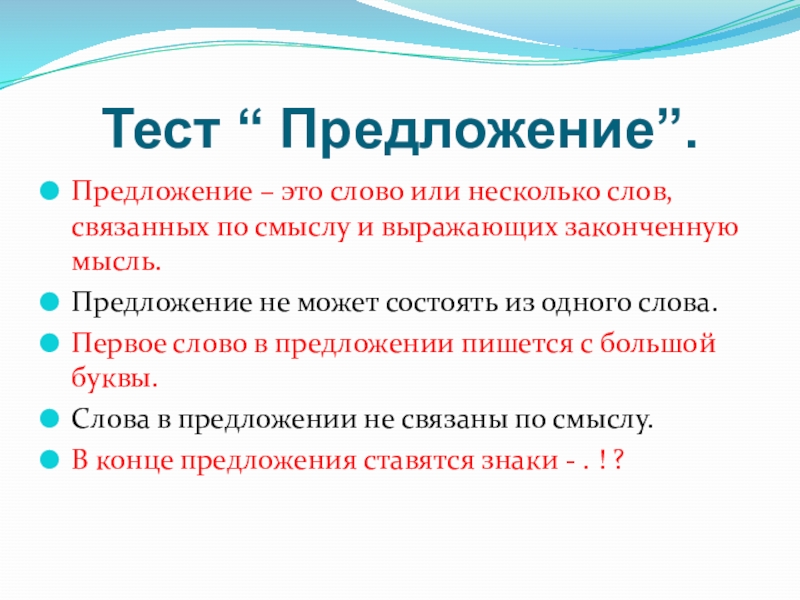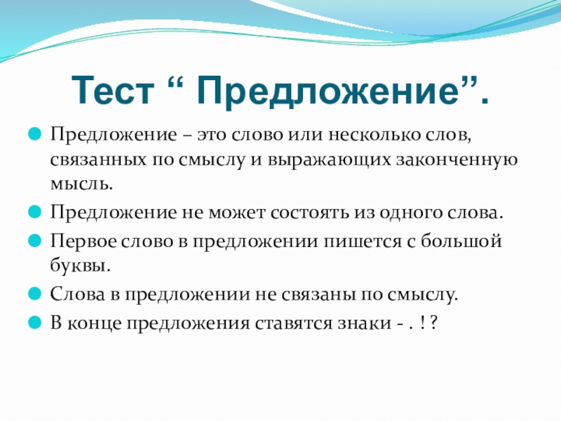 Тест “ Предложение”.Предложение – это слово или несколько слов, связанных по смыслу и выражающих законченную мысль.Предложение не