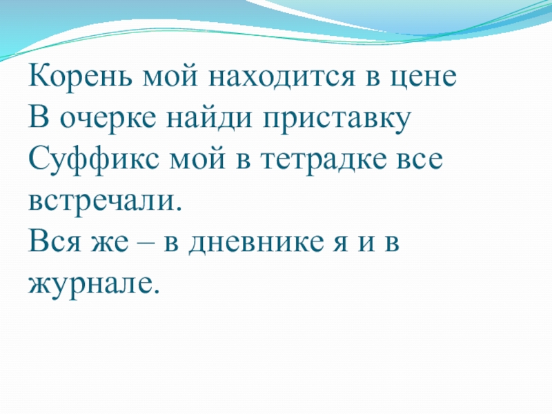 Слайд 15 Корень мой находится в цене В очерке найди приставку Суффикс мой в тетрадке