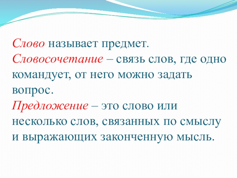 Слово называет предмет. Словосочетание – связь слов, где одно командует, от него можно задать вопрос. Предложение – это слово или