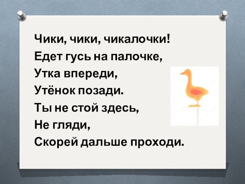Чики, чики, чикалочки!Едет гусь на палочке, Утка впереди, Утёнок позади.Ты не стой здесь, Не гляди, Скорей дальше