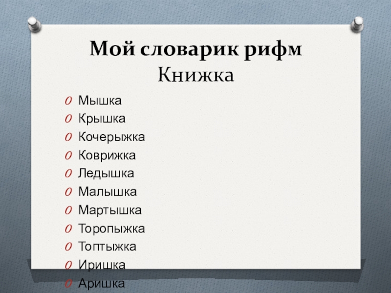 Мой словарик рифм КнижкаМышкаКрышкаКочерыжкаКоврижкаЛедышкаМалышкаМартышкаТоропыжкаТоптыжкаИришкаАришкаВрунишкаШишкаПрипрыжкаУхтышкаМальчишка