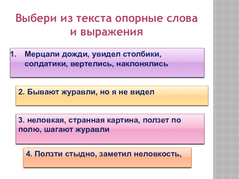 3. неловкая, странная картина, ползет по полю, шагают журавли