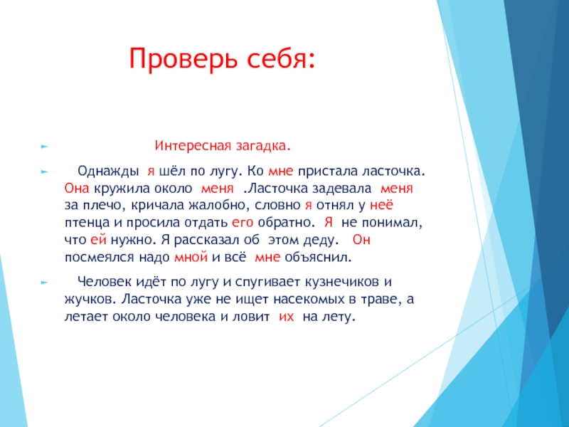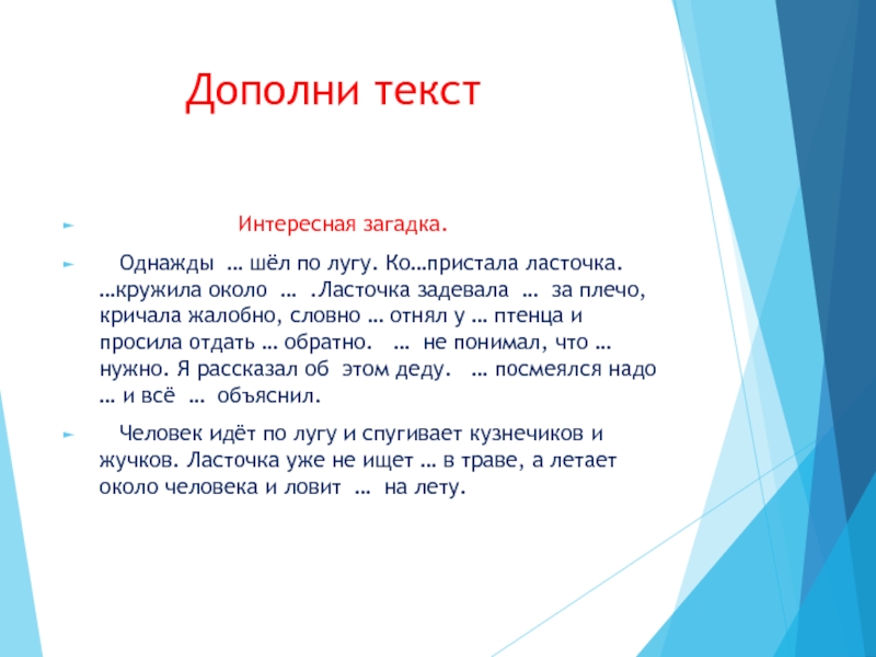 Дополни текст Интересная загадка. Однажды … шёл по лугу. Ко…пристала ласточка. …кружила около … .Ласточка задевала … за плечо, кричала