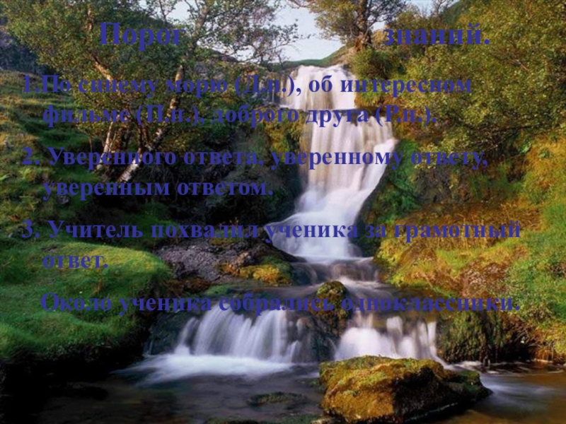 1.По синему морю (Д.п.), об интересном фильме (П.п.), доброго друга (Р.п.).