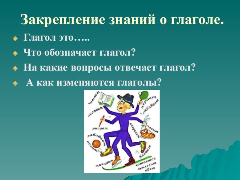 Закрепление знаний о глаголе.  Глагол это…..Что обозначает глагол?На какие вопросы отвечает глагол? А как изменяются глаголы?