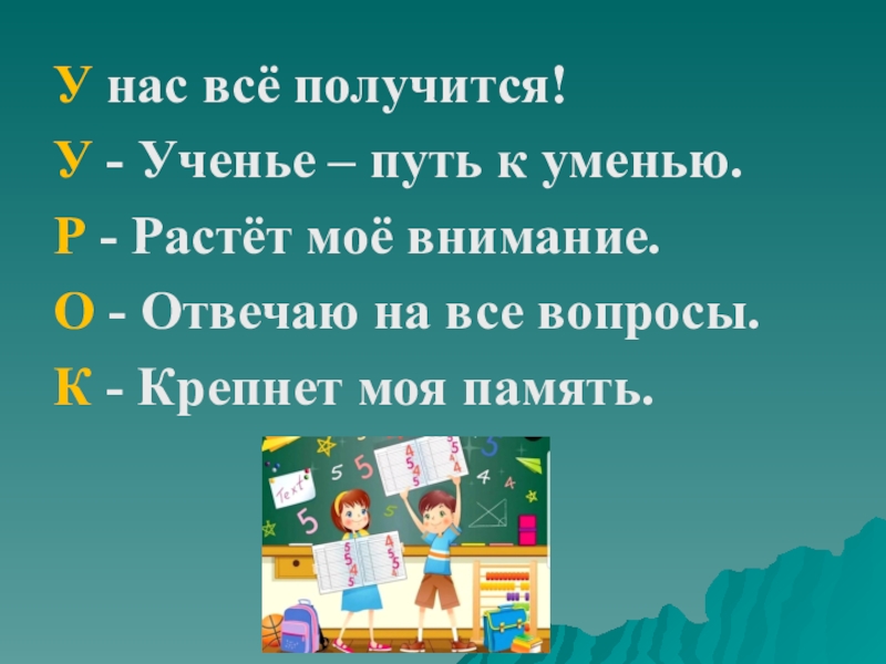 У нас всё получится!У - Ученье – путь к уменью.Р - Растёт моё внимание.О - Отвечаю на все вопросы.К - Крепнет моя память.