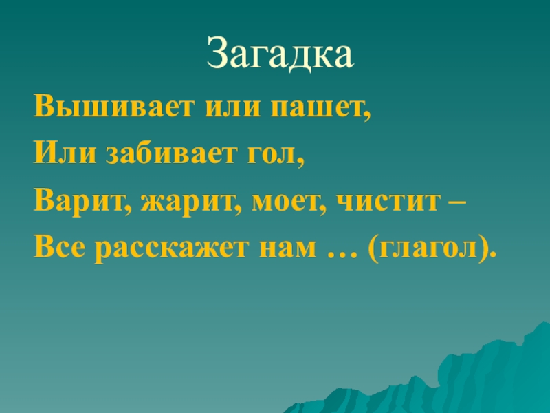 ЗагадкаВышивает или пашет,Или забивает гол,Варит, жарит, моет, чистит –Все расскажет нам … (глагол).