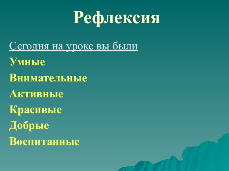 РефлексияСегодня на уроке вы были УмныеВнимательныеАктивныеКрасивыеДобрыеВоспитанные