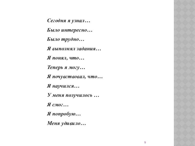 Сегодня я узнал…Было интересно…Было трудно…Я выполнял задания…Я понял, что…Теперь я могу…Я почувствовал, что…Я научился…У меня получилось …Я