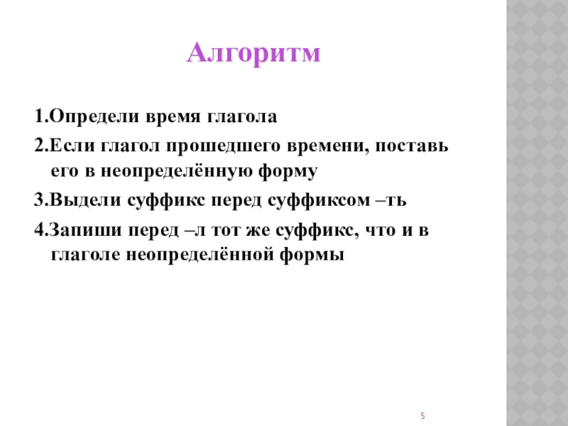 Алгоритм1.Определи время глагола2.Если глагол прошедшего времени, поставь его в неопределённую форму3.Выдели суффикс перед суффиксом –ть4.Запиши перед –л