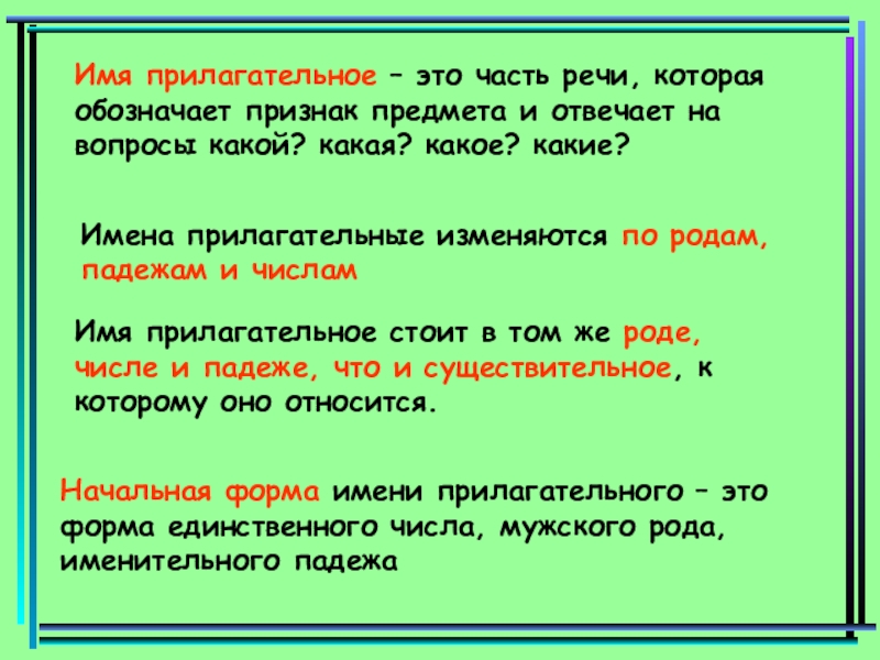Имя прилагательное стоит в том же роде, числе и падеже, что и существительное, к которому оно относится.