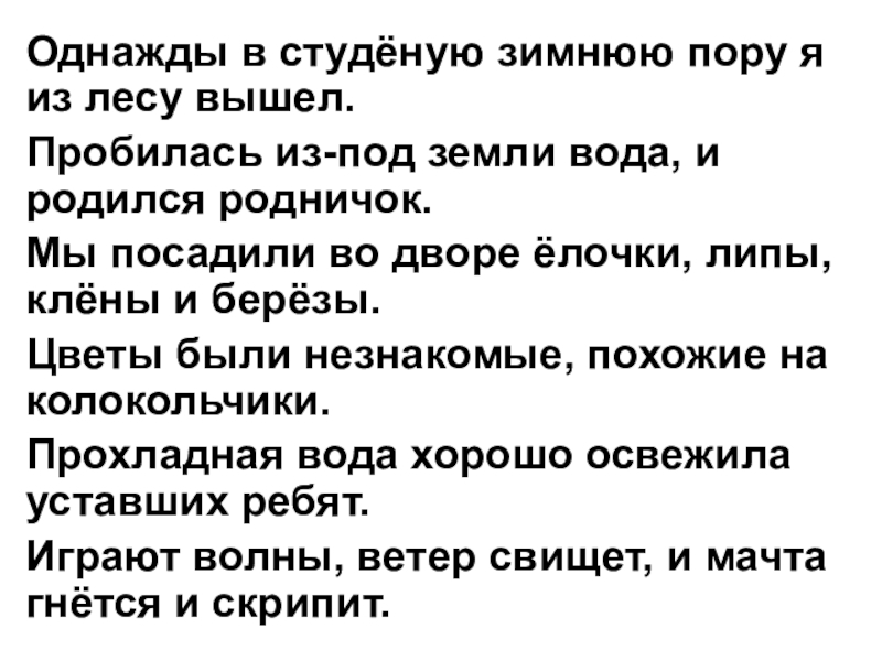 Однажды в студёную зимнюю пору я из лесу вышел.Пробилась из-под земли вода, и родился родничок.Мы посадили во