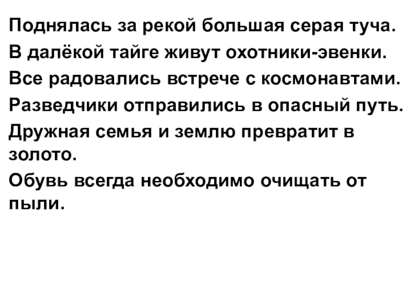 Поднялась за рекой большая серая туча.В далёкой тайге живут охотники-эвенки.Все радовались встрече с космонавтами.Разведчики отправились в опасный