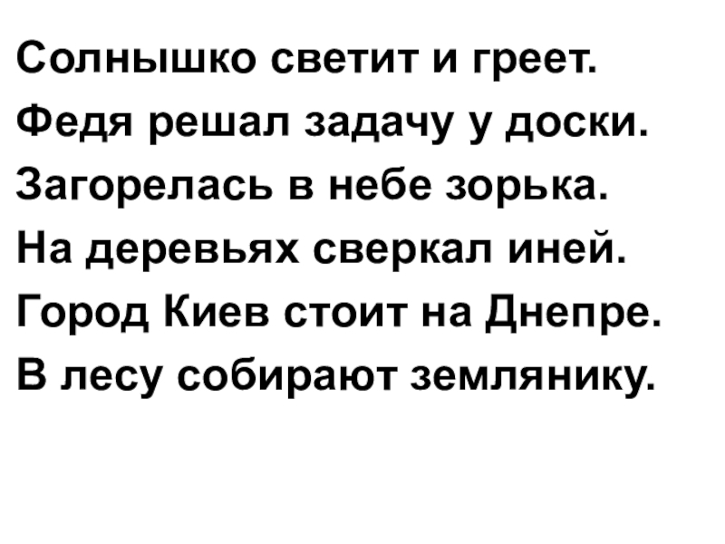 Солнышко светит и греет.Федя решал задачу у доски.Загорелась в небе зорька.На деревьях сверкал иней.Город Киев стоит на
