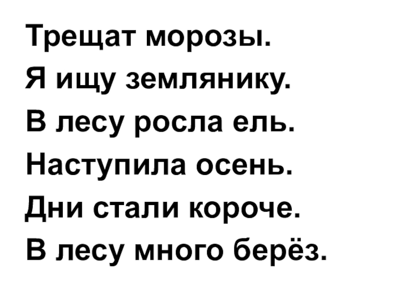Трещат морозы.Я ищу землянику.В лесу росла ель.Наступила осень.Дни стали короче.В лесу много берёз.