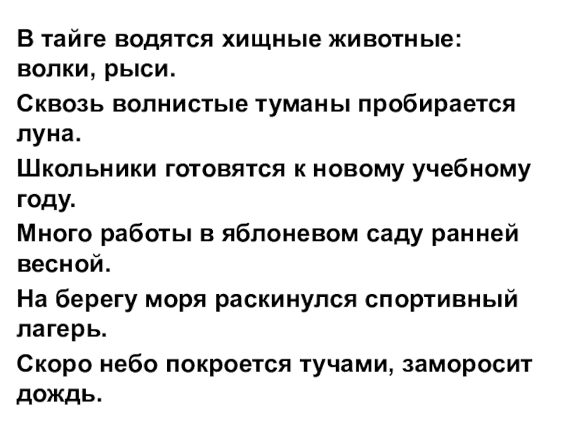 В тайге водятся хищные животные: волки, рыси.Сквозь волнистые туманы пробирается луна.Школьники готовятся к новому учебному году.Много работы