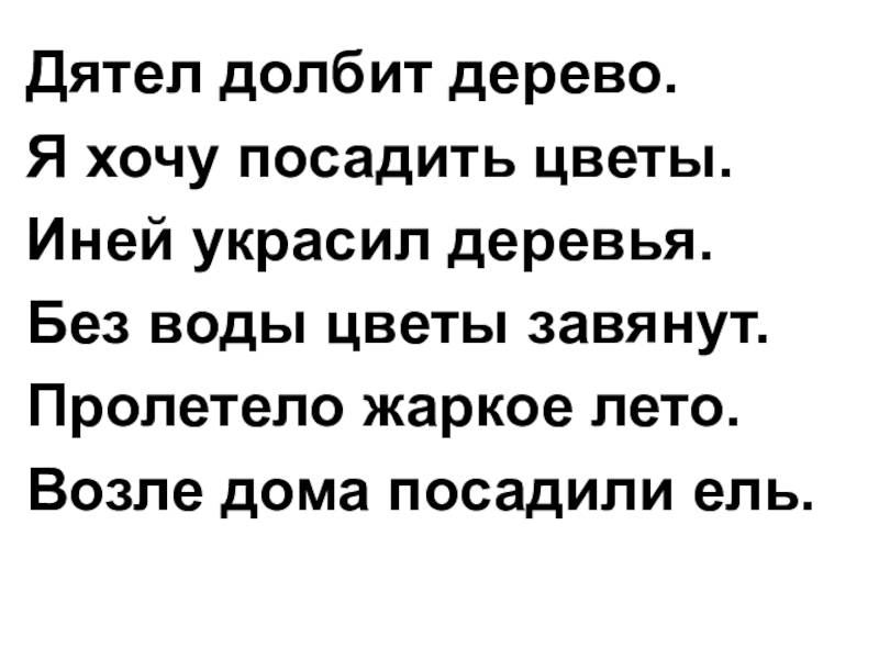 Дятел долбит дерево.Я хочу посадить цветы.Иней украсил деревья.Без воды цветы завянут.Пролетело жаркое лето.Возле дома посадили ель.