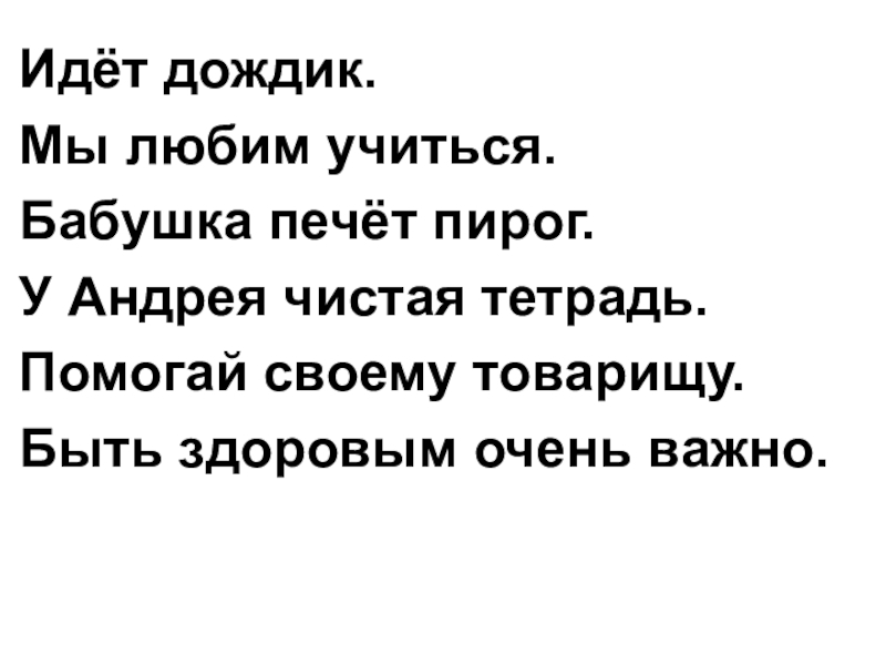 Идёт дождик.Мы любим учиться.Бабушка печёт пирог.У Андрея чистая тетрадь.Помогай своему товарищу.Быть здоровым очень важно.