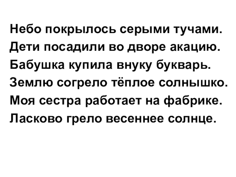 Небо покрылось серыми тучами.Дети посадили во дворе акацию.Бабушка купила внуку букварь.Землю согрело тёплое солнышко.Моя сестра работает на