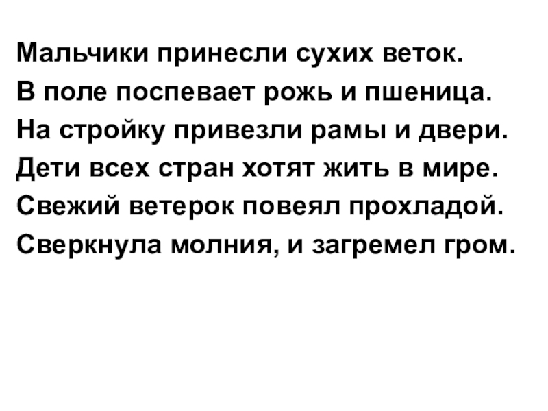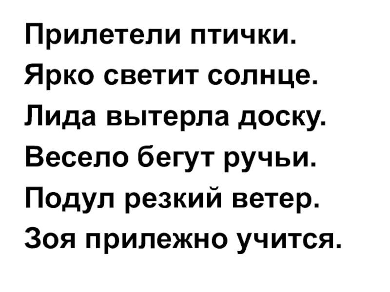 Прилетели птички.Ярко светит солнце.Лида вытерла доску.Весело бегут ручьи.Подул резкий ветер.Зоя прилежно учится.