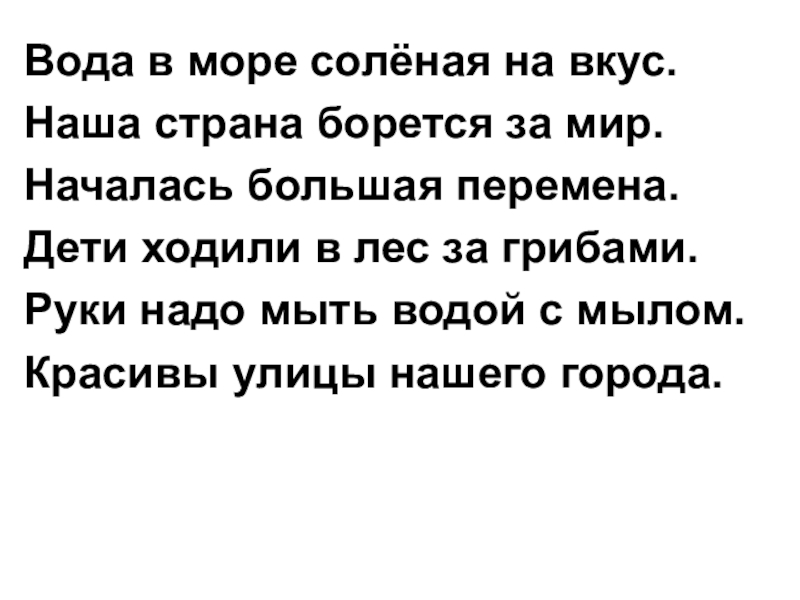 Вода в море солёная на вкус.Наша страна борется за мир.Началась большая перемена.Дети ходили в лес за грибами.Руки