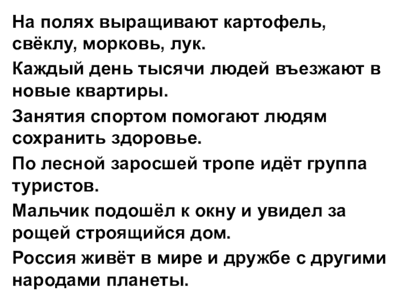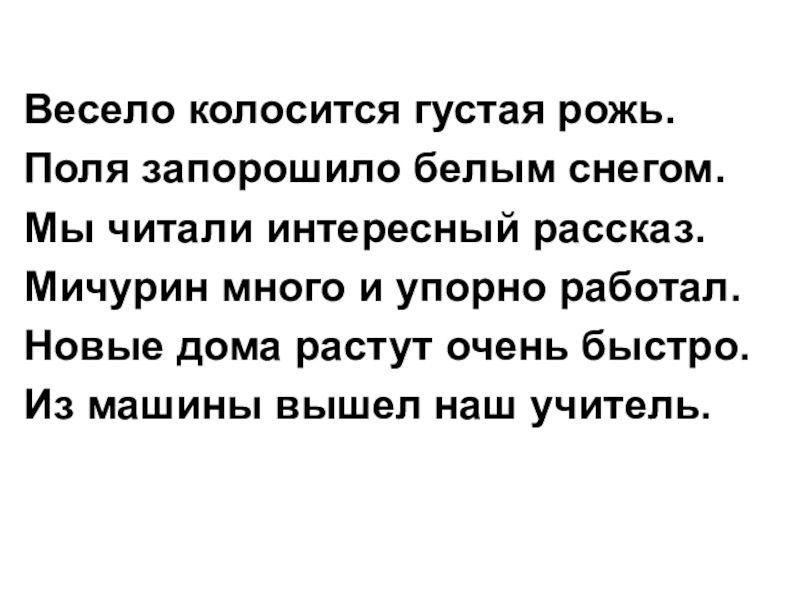 Весело колосится густая рожь.Поля запорошило белым снегом.Мы читали интересный рассказ.Мичурин много и упорно работал.Новые дома растут очень