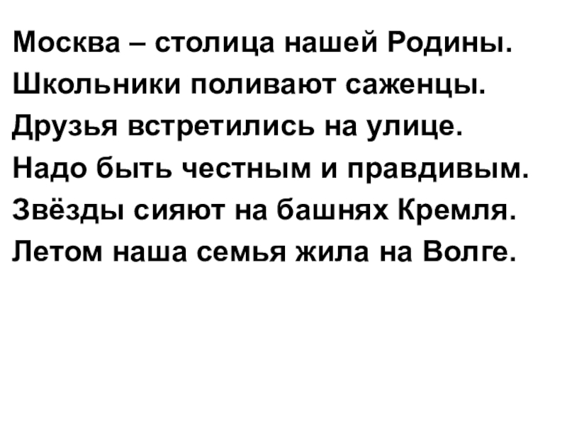 Москва – столица нашей Родины.Школьники поливают саженцы.Друзья встретились на улице.Надо быть честным и правдивым.Звёзды сияют на башнях
