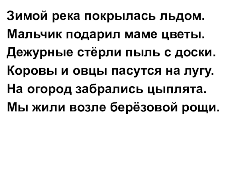 Зимой река покрылась льдом.Мальчик подарил маме цветы.Дежурные стёрли пыль с доски.Коровы и овцы пасутся на лугу.На огород