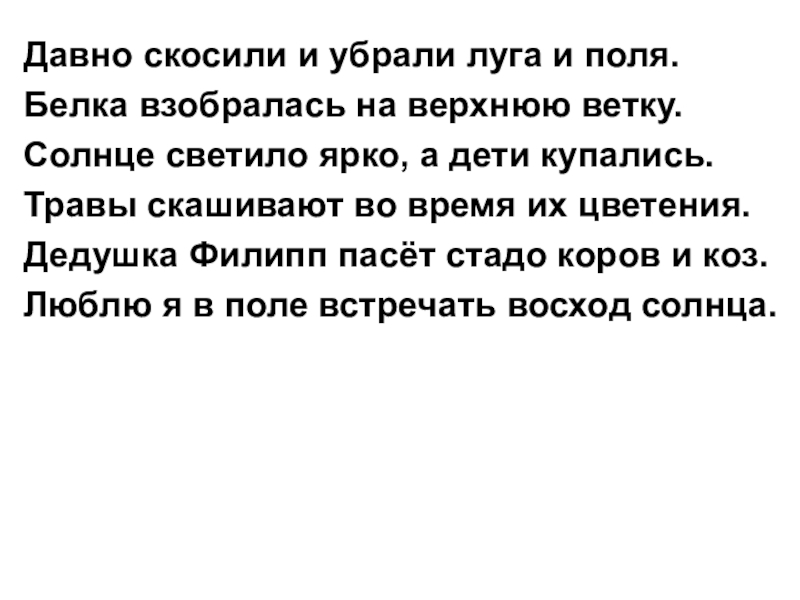 Давно скосили и убрали луга и поля.Белка взобралась на верхнюю ветку.Солнце светило ярко, а дети купались.Травы скашивают