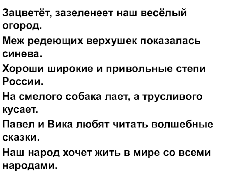 Зацветёт, зазеленеет наш весёлый огород.Меж редеющих верхушек показалась синева.Хороши широкие и привольные степи России.На смелого собака лает,