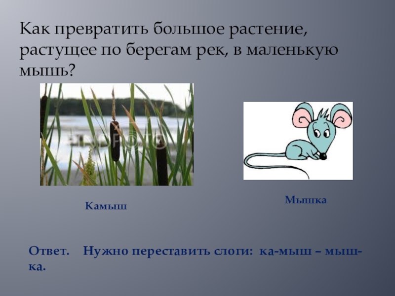 Ответ. Нужно переставить слоги: ка-мыш – мыш-ка.