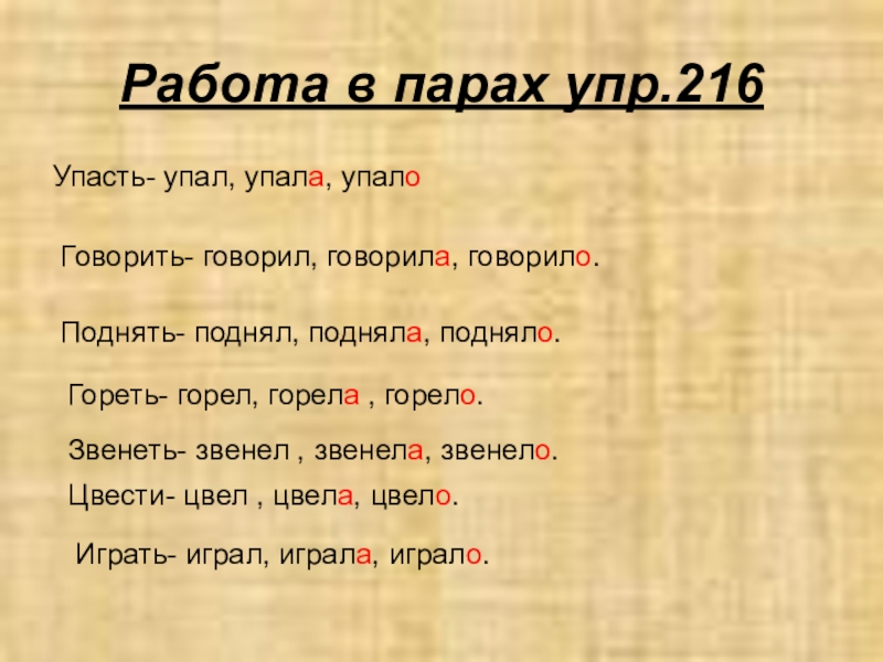 Играть- играл, играла, играло.