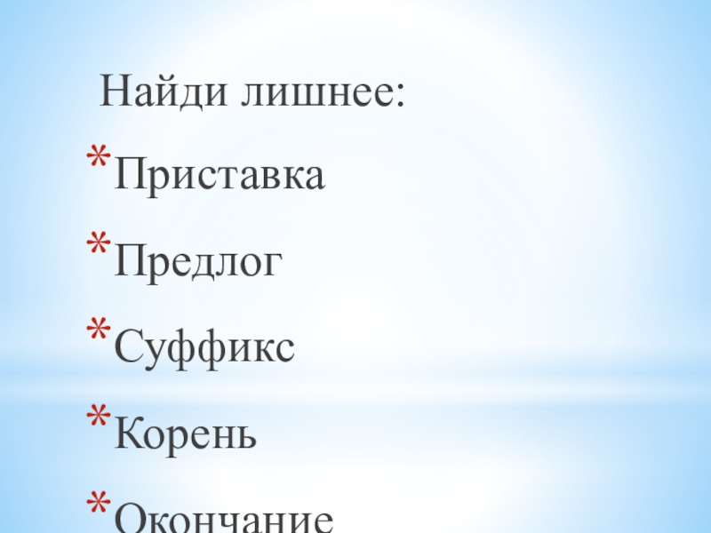 Найди лишнее:ПриставкаПредлогСуффиксКореньОкончание