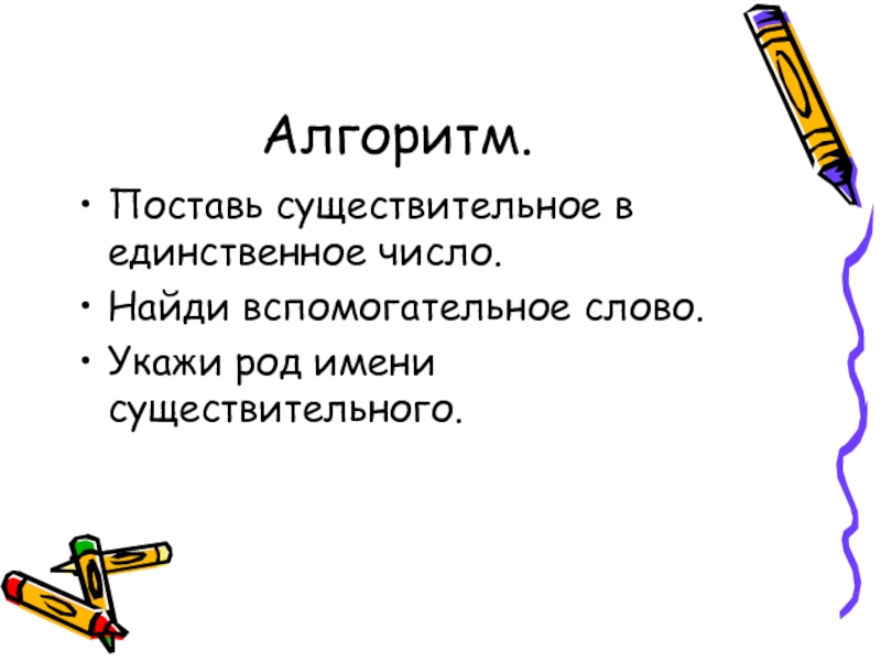 Алгоритм.Поставь существительное в единственное число.Найди вспомогательное слово.Укажи род имени существительного.