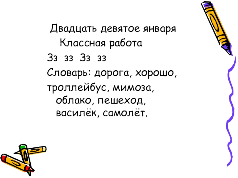 Двадцать девятое января  Классная работа Зз зз Зз ззСловарь: дорога, хорошо, троллейбус, мимоза, облако, пешеход,