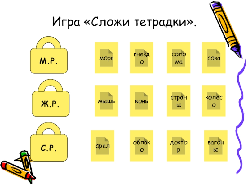 Ж.Р.М.Р.С.Р.Игра «Сложи тетрадки».морягнездосоломасовамышьконьстраныколесоорелоблакодокторвагоны