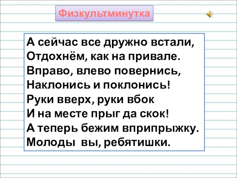 ФизкультминуткаА сейчас все дружно встали,Отдохнём, как на привале.Вправо, влево повернись,Наклонись и поклонись!Руки вверх, руки вбокИ на месте