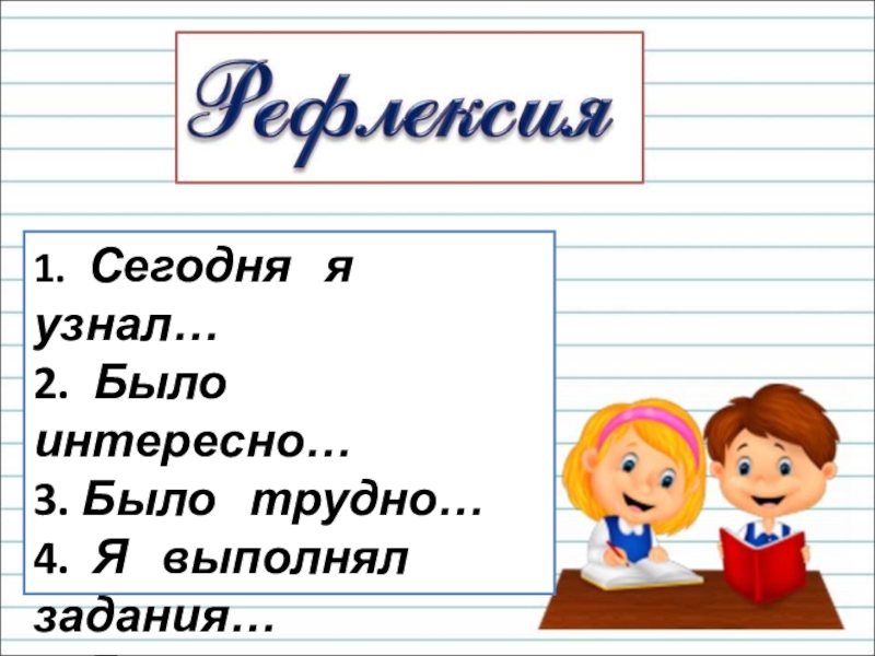 1.  Сегодня  я   узнал…2.  Было интересно…3. Было  трудно…4.  Я  выполнял  задания…5. Я понял,  что…